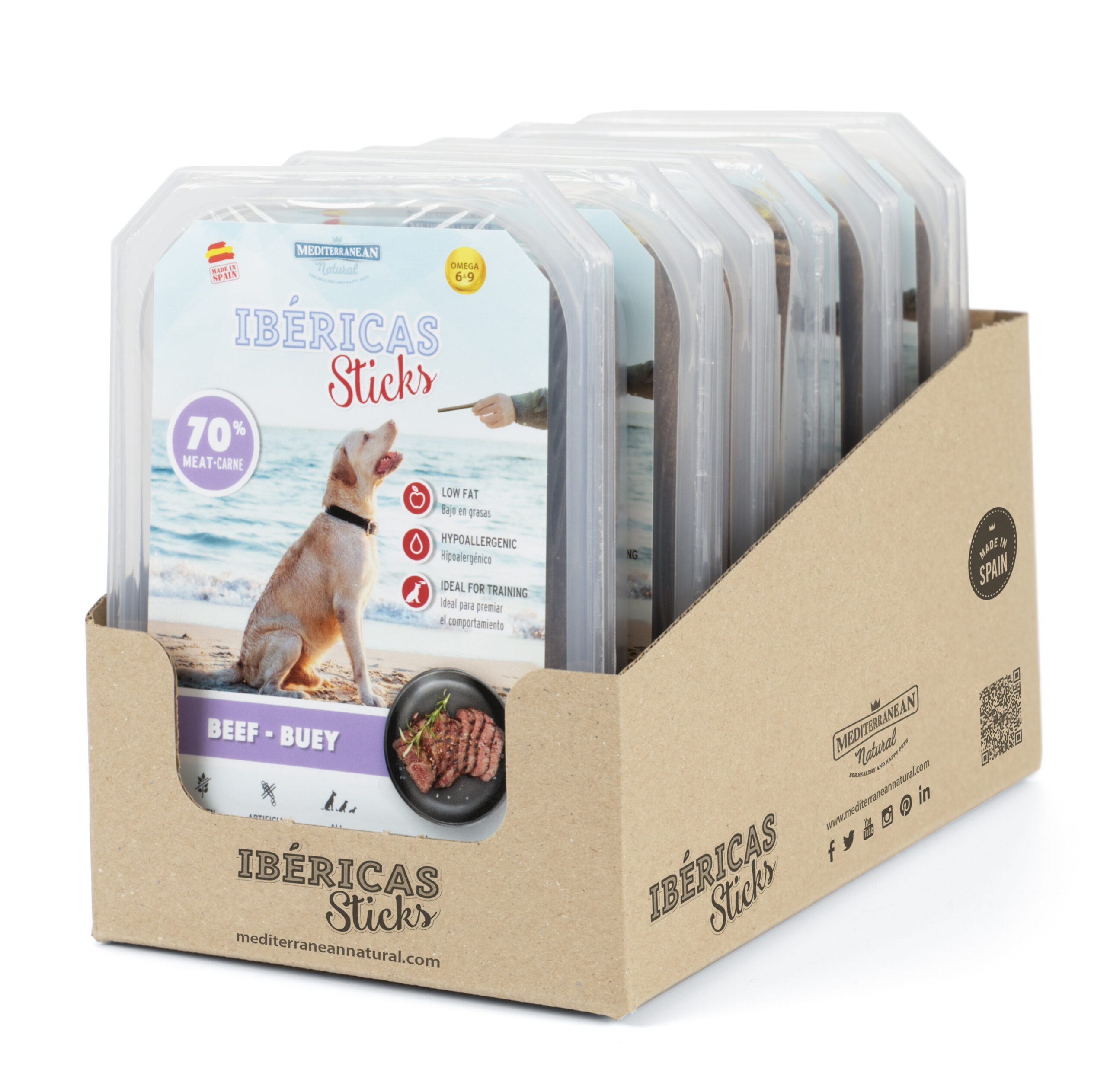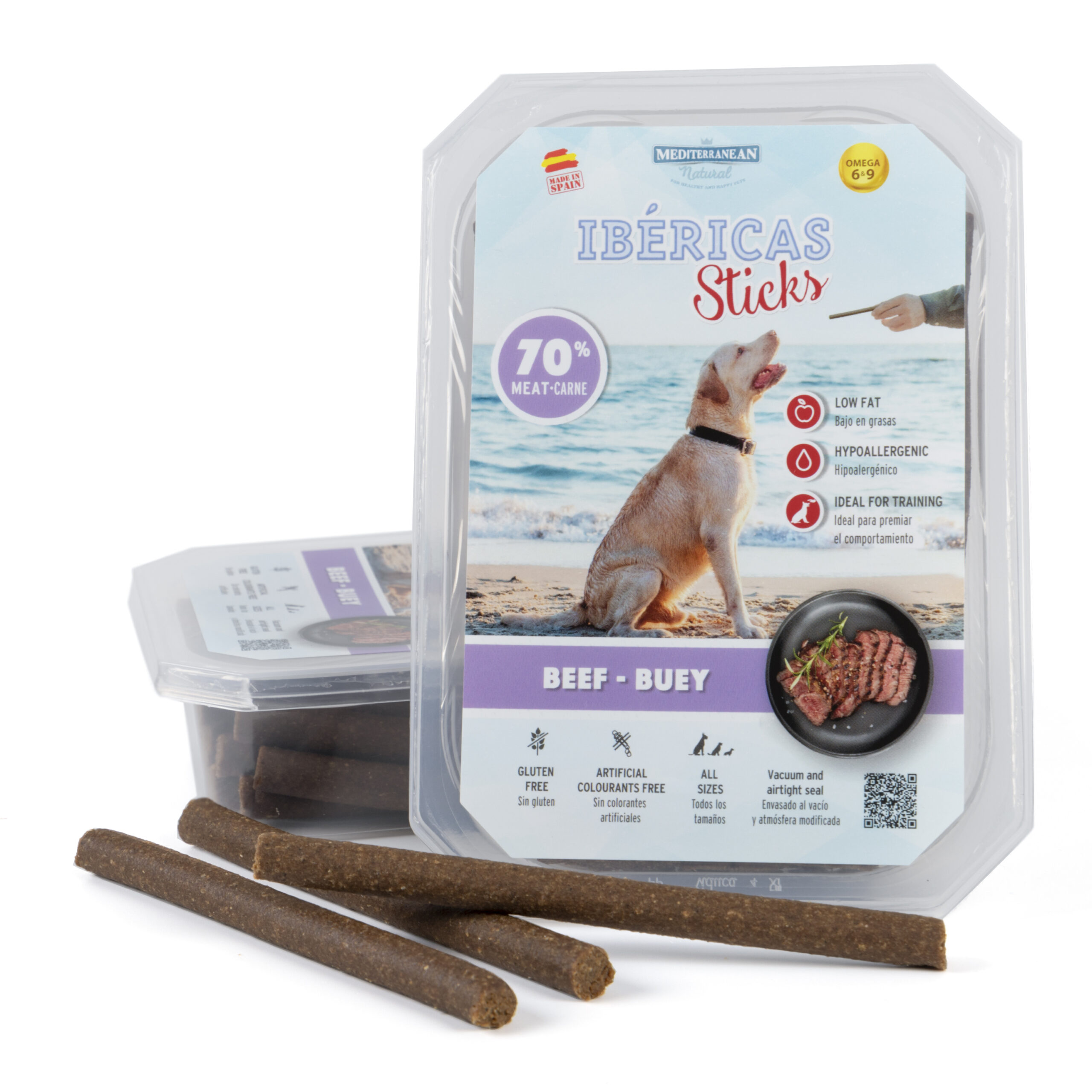 Halbfeuchte Premium-Sticks mit Rind für Hunde. Die Ibéricas Sticks von Mediterranean Natural sind die idealen Snacks für das tägliche Training und die Belohnung unseres Hundes.