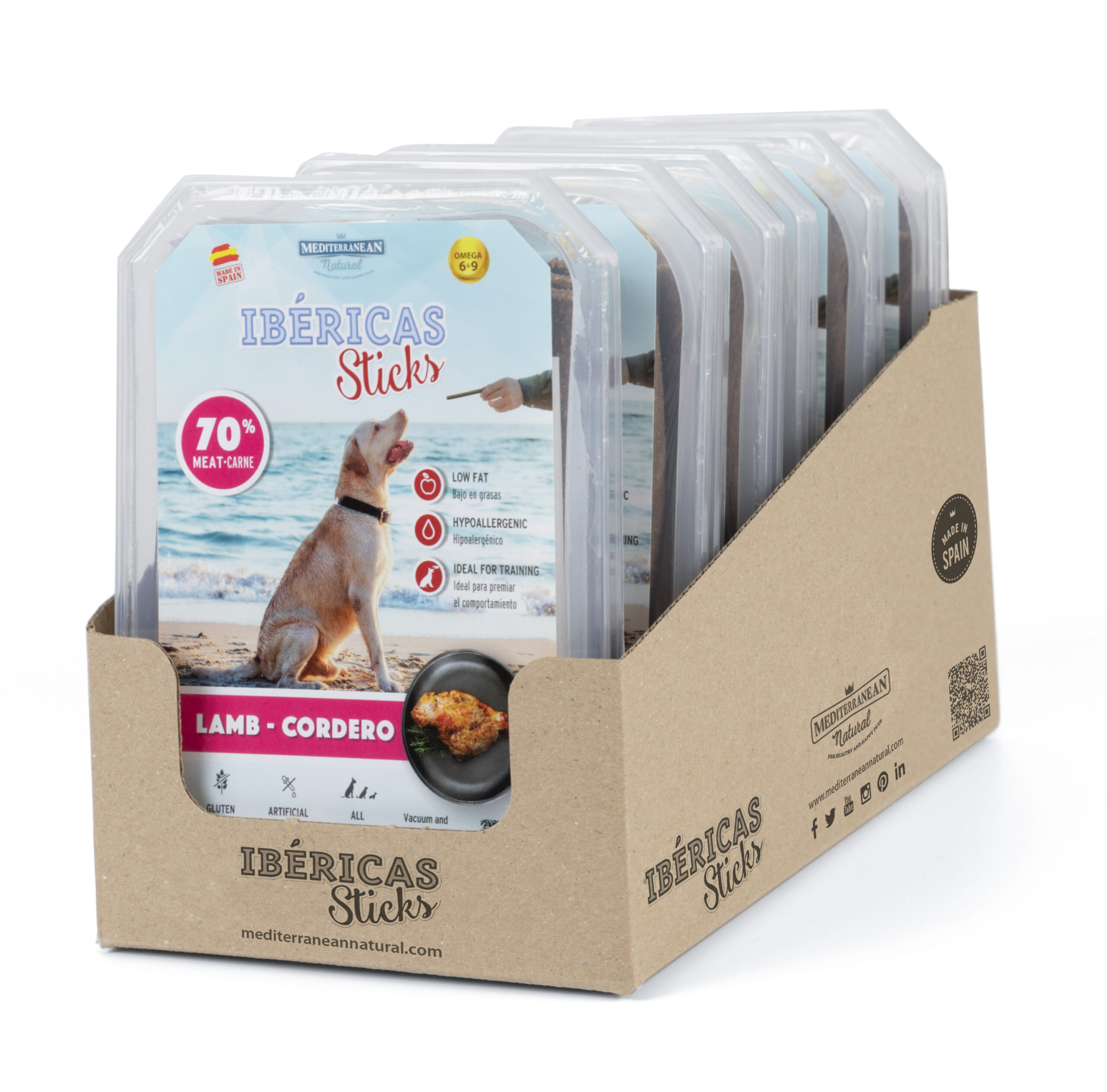 Halbfeuchte Premium-Sticks mit Lamm für Hunde. Die Ibéricas Sticks von Mediterranean Natural sind die idealen Snacks für das tägliche Training und die Belohnung unseres Hundes.
