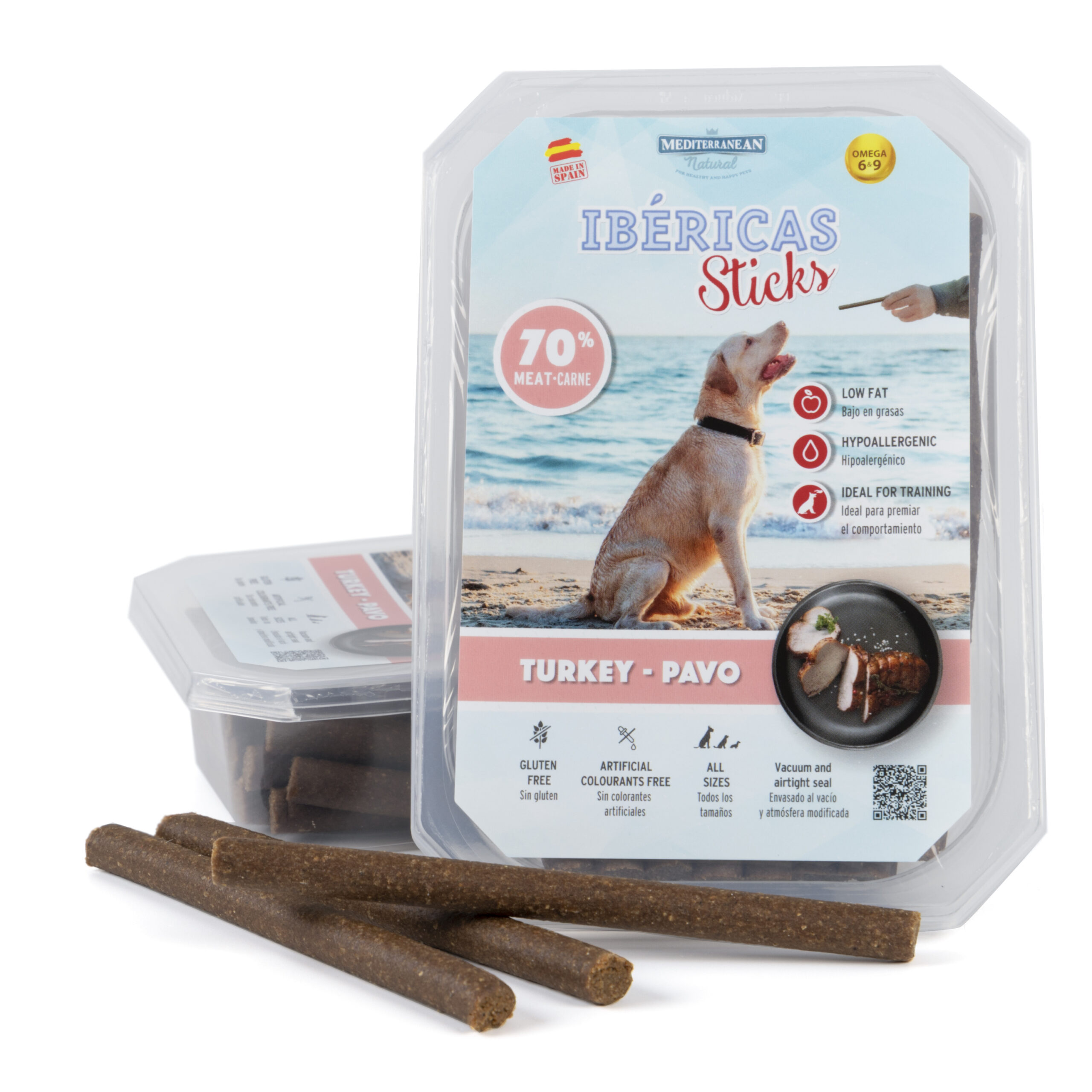 Halbfeuchte Premium-Sticks mit Truthahn für Hunde. Die Ibéricas Sticks von Mediterranean Natural sind die idealen Snacks für das tägliche Training und die Belohnung unseres Hundes.