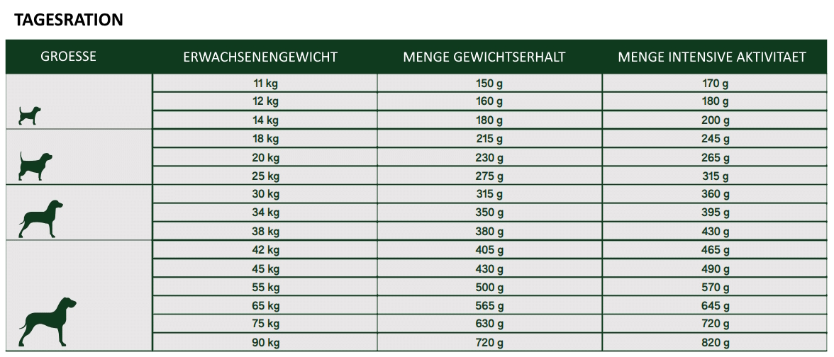 Natura Diet Grain Free Ente ist ein vollwertiges Alleinfuttermittel – einfach pur füttern. Die Mengen richten sich nach Gewicht, Aktivität und Alter deines Hundes.