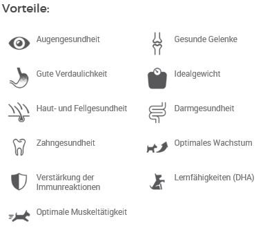 Rohprotein 34%, Rohfett 14%, Rohasche 7.5%, Rohfaser 2%, Calcium 1.15%, Phosphor 0.85%, Verwertbare Energie 3’907 kcal/kg, Feuchtigkeit 10%